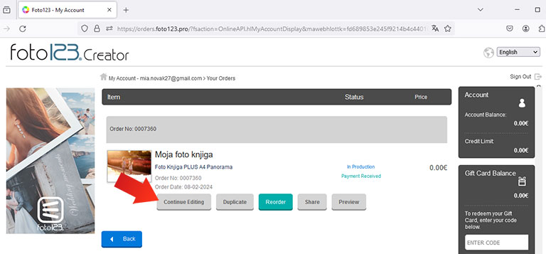- Click on “Continue editing” for your submitted order and the project in which you want to make a correction. If the button is not available, it means that we have not yet unlocked the order for editing, or click on the refresh page to see the latest changes. Warning: You can only make a correction once in a project. Once you save the project, the order correction is downloaded again and then locked again for editing.